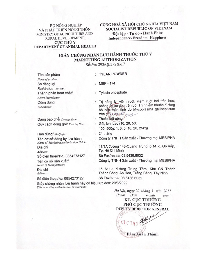 + Phòng bệnh : 1kg/2 tấn thức ăn, dùng liên tục 3 - 4 ngày.